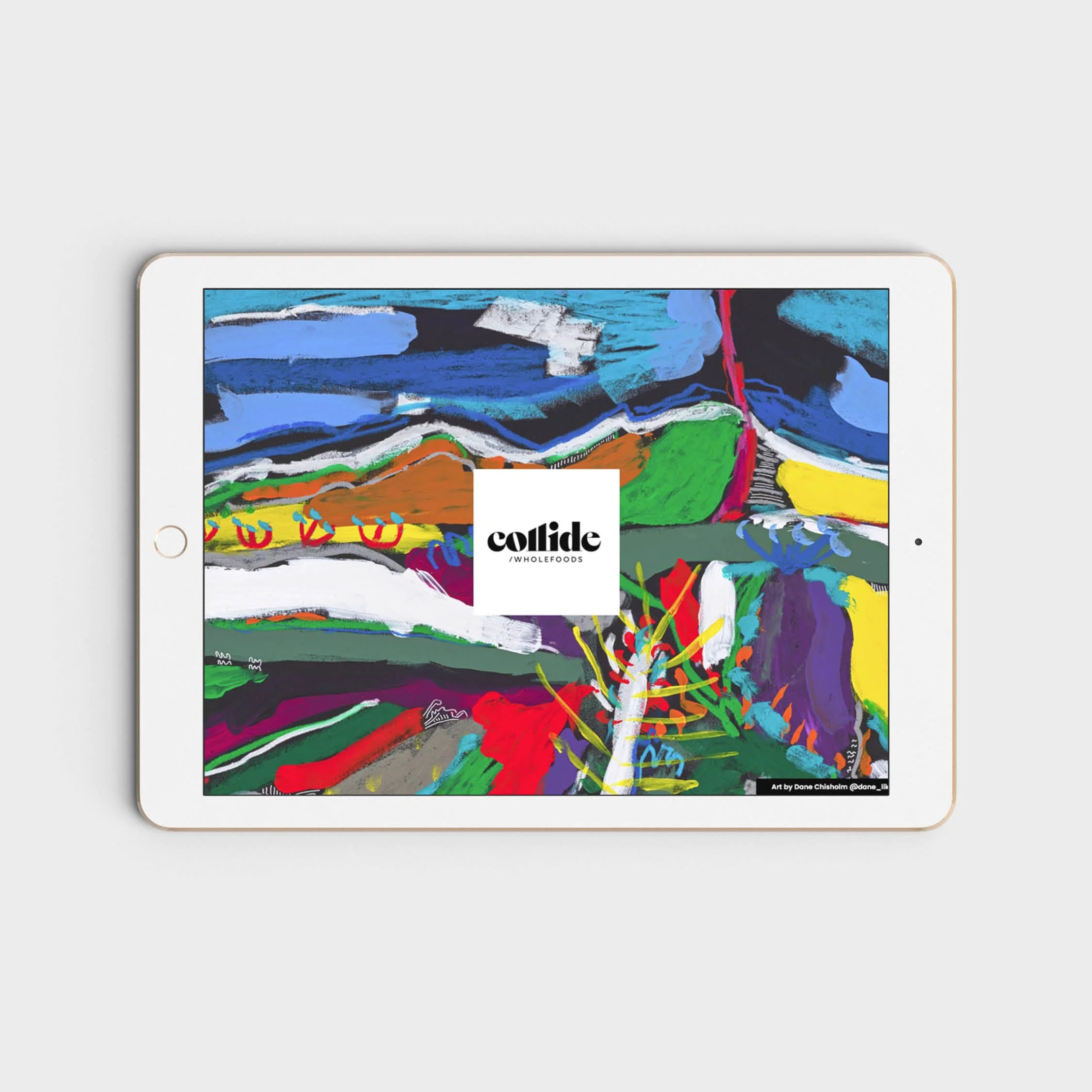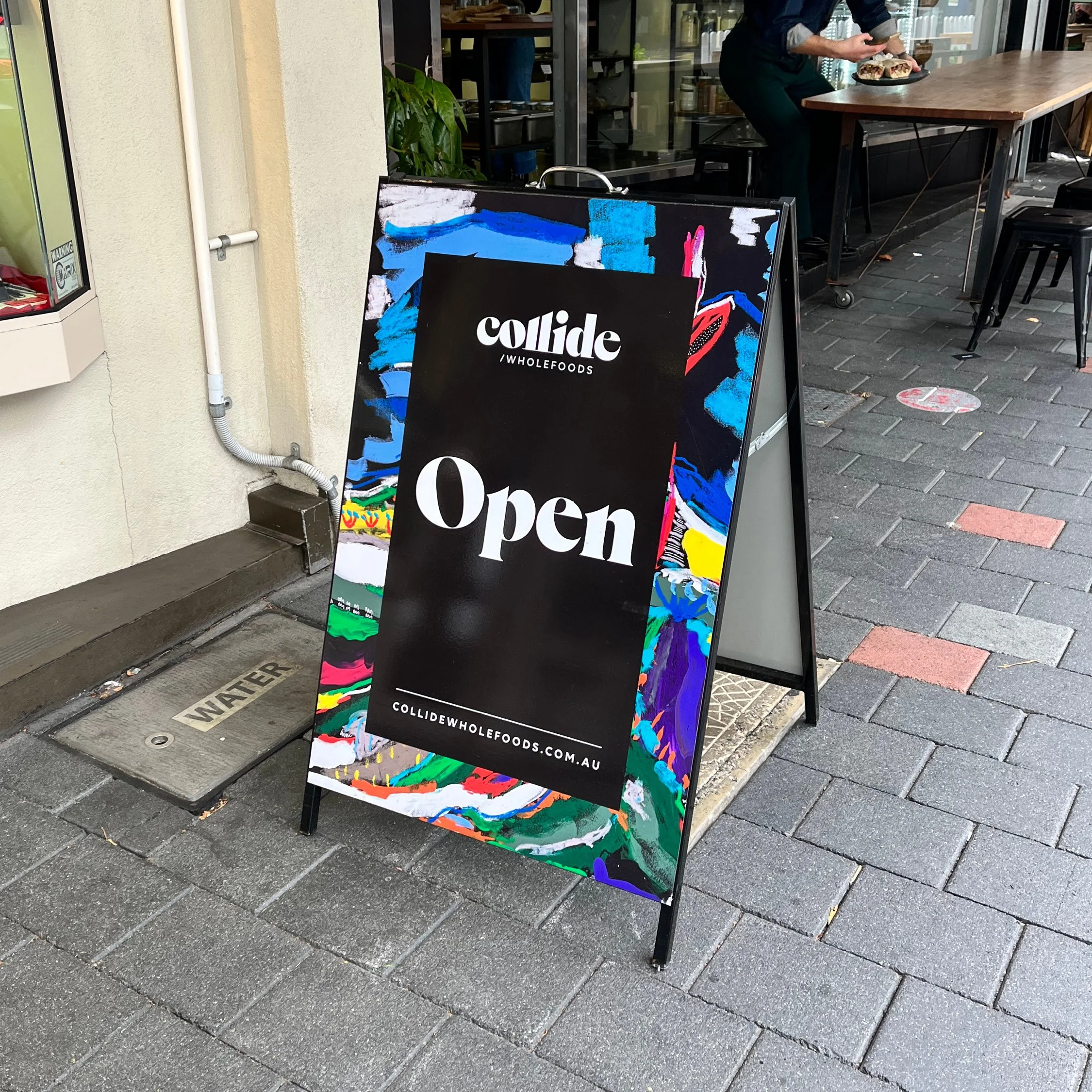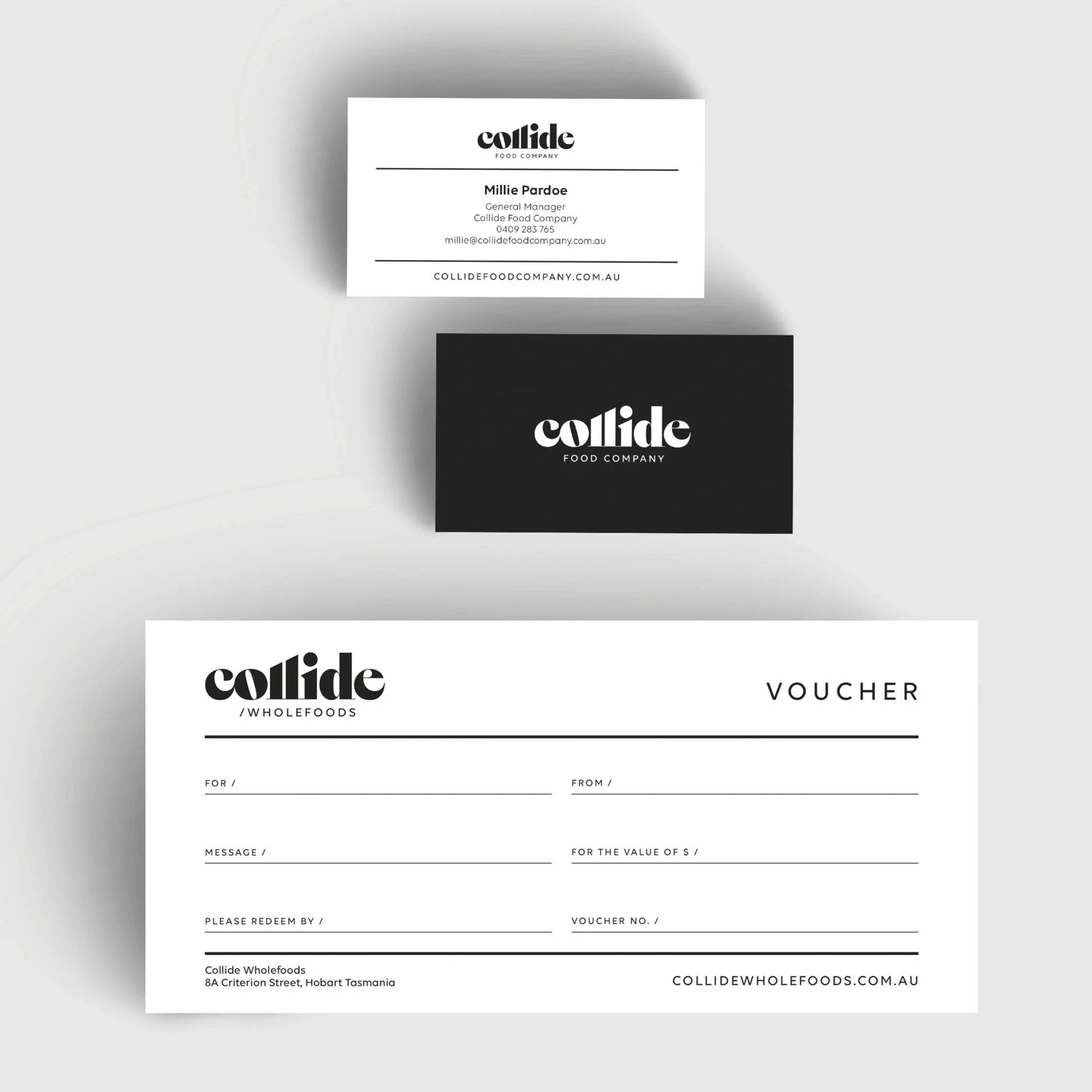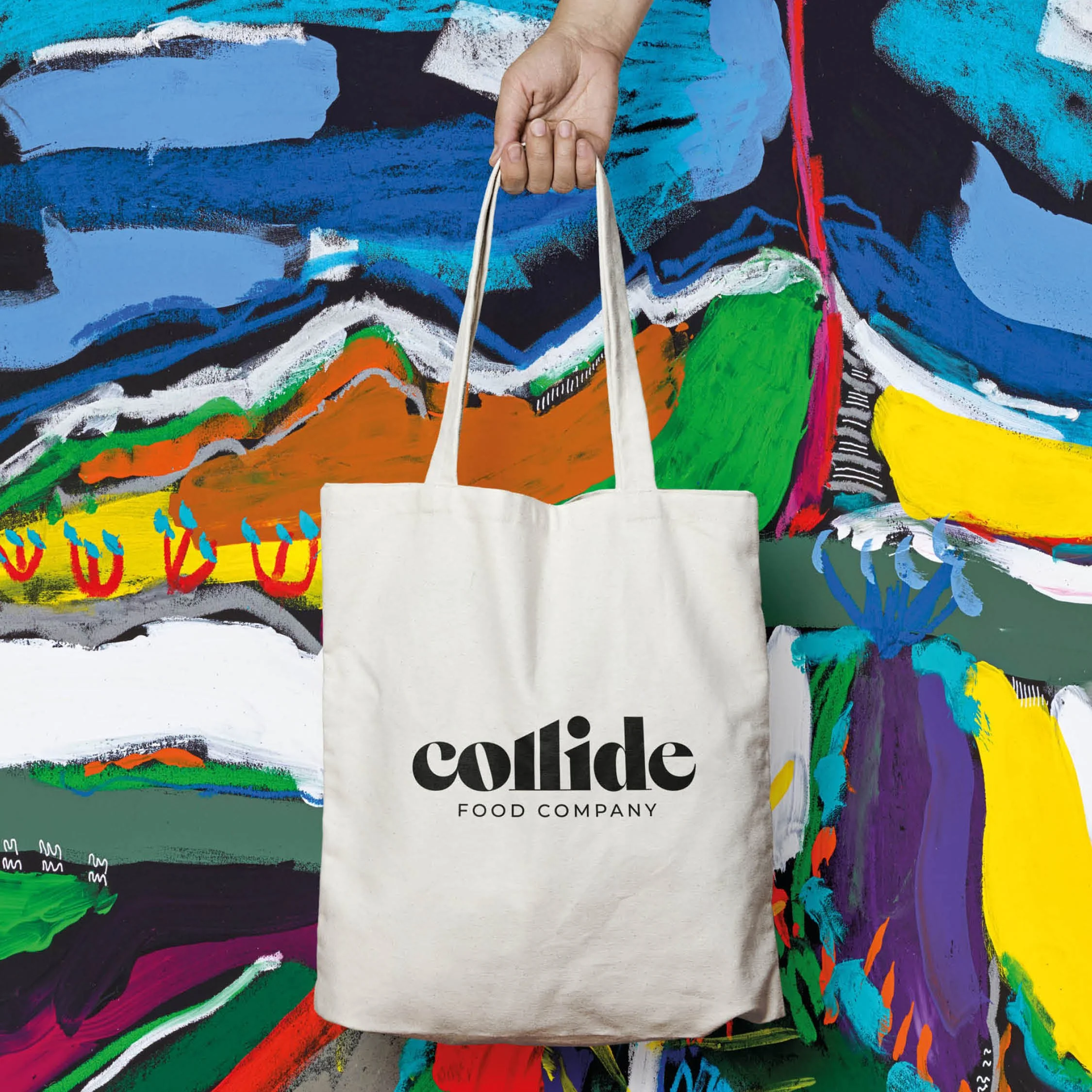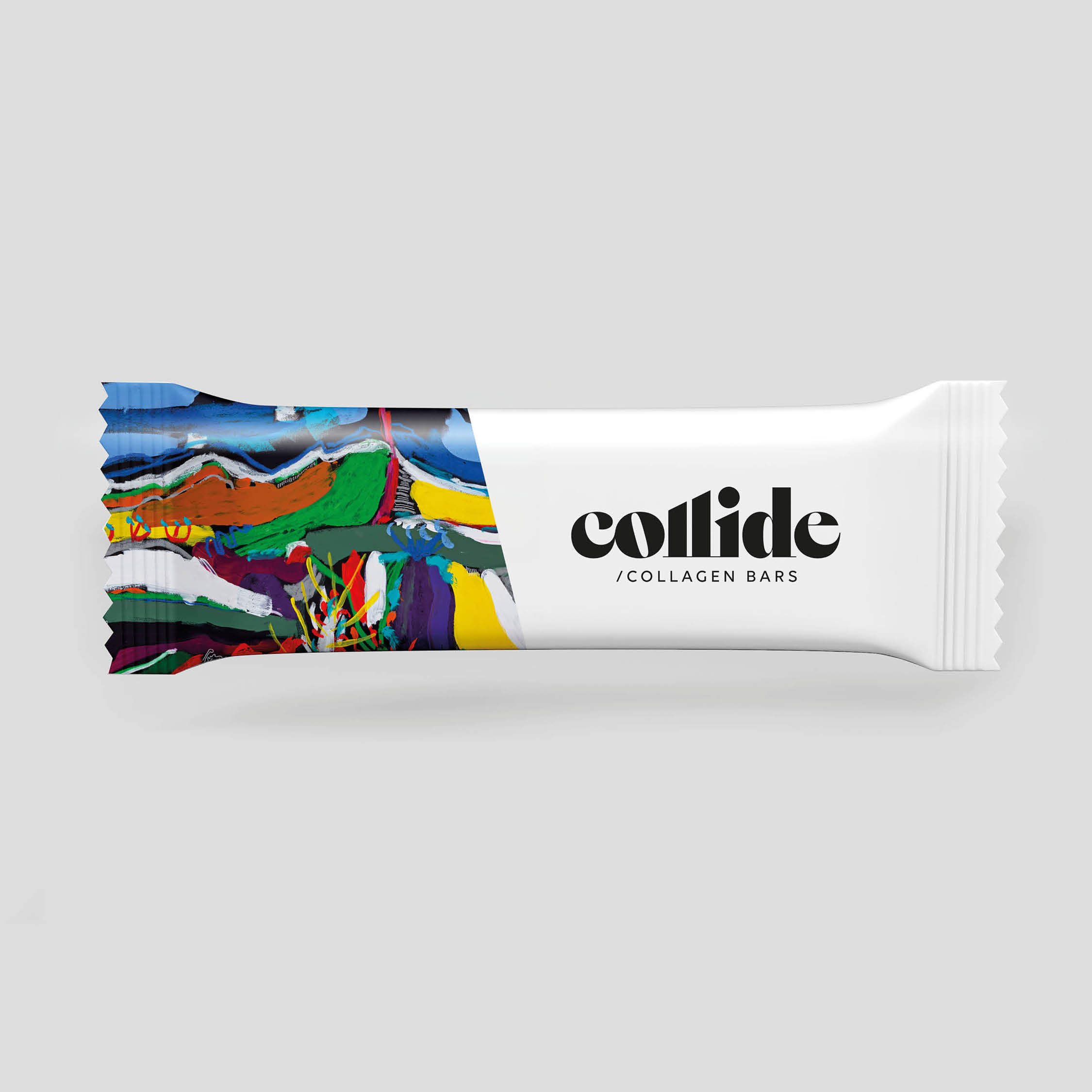 As part of the project, we commissioned Tasmanian artist Dane Chisholm to create a unique artwork that would be used across a variety of the store’s collateral and on a large banner that hangs in the store’s front window. The Collide brand needed to work as a parent brand, with multiple sub brand expressions, such as Collide / Wholefoods, Collide Food / Company, Collide / Collagen Bars, etc. We were able to easily arrive at a flexible brand system and aesthetic by embracing a very trusting and open client/designer relationship.