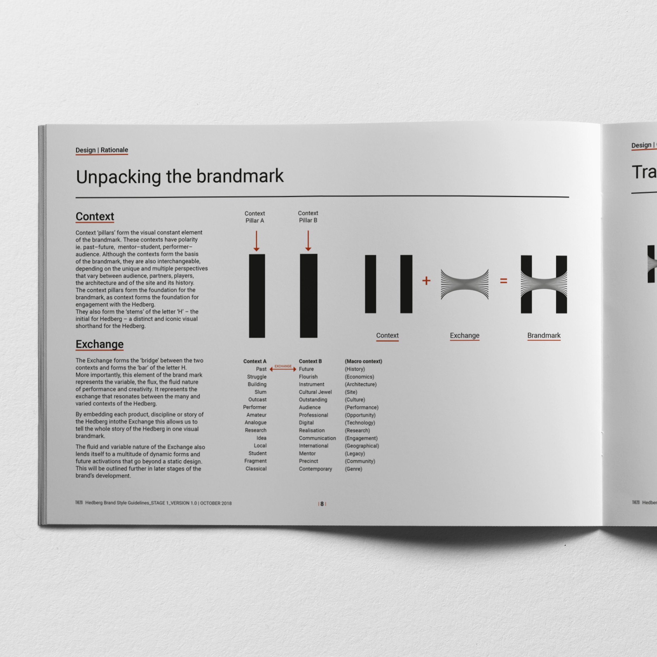 A deep-dive concept process lead to the question of how can we embed every context of the Hedberg into the DNA of the brandmark? The expression of this idea begins with finding and illustrating the unifying element – Exchange.
