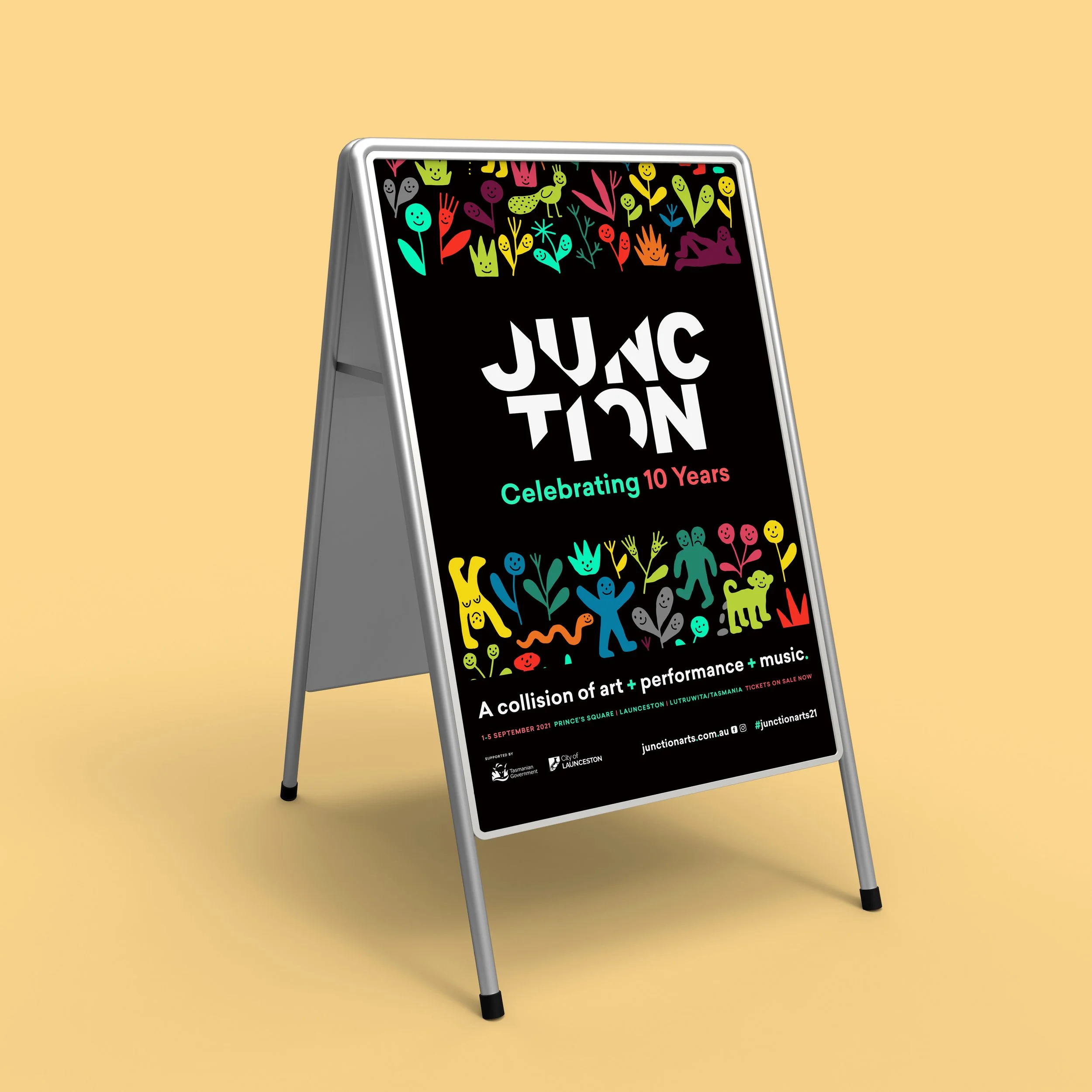 Junction's festival heart is the fountain in Prince's Square. From here it radiates out to reveal and celebrate Launceston’s unique spaces, connecting audiences with the most dynamic and innovative new work within the state. The identity for Junction Arts Festival 2021 was created in collaboration with artist Tom O’Hern to create a unique, fun and humorous set of illustrations to be used across the festival collateral.