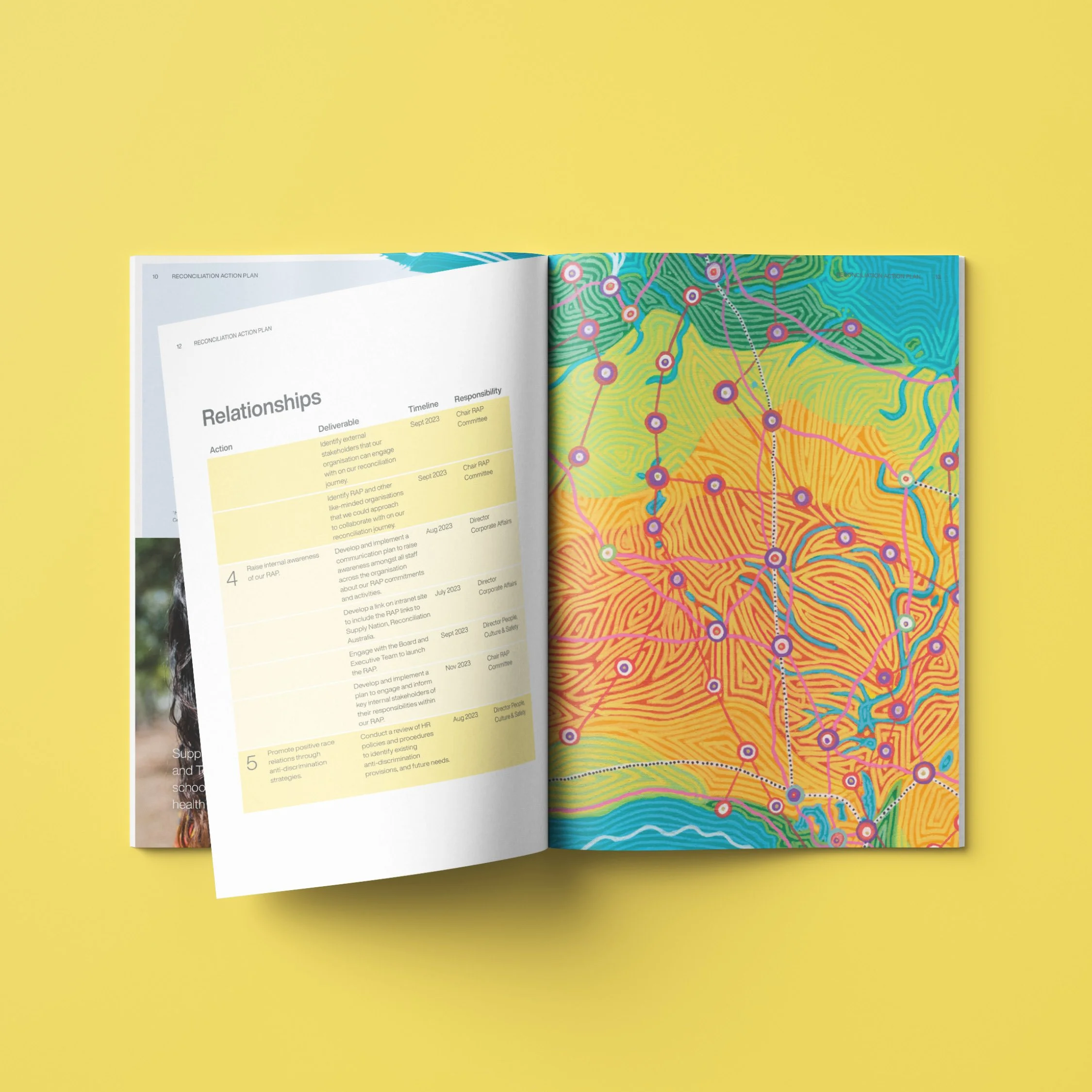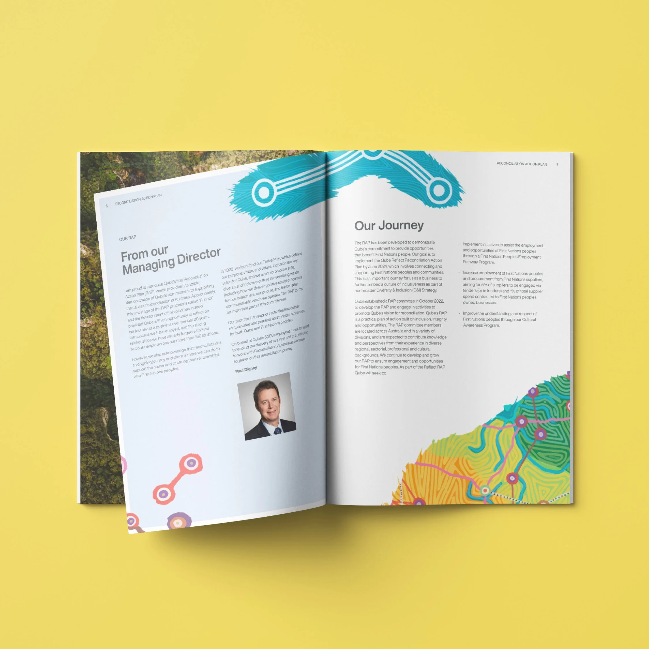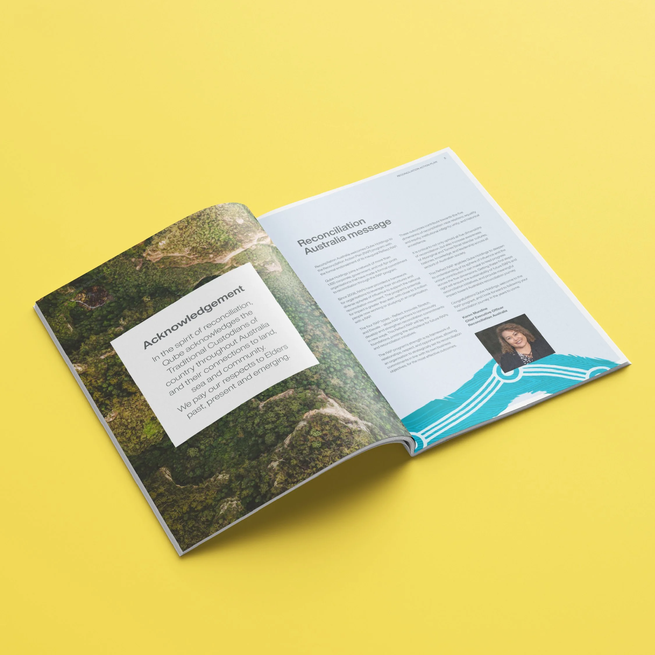 In 2023, they released their Reflect Reconciliation Action Plan (RAP). This plan outlines Qube’s values and goals as a business to respect, acknowledge and provide opportunity to Aboriginal and Torres Strait Islanders. The RAP features custom-created artwork ‘Yindyamarra’ by Sydney based artist Darren Charlwood.