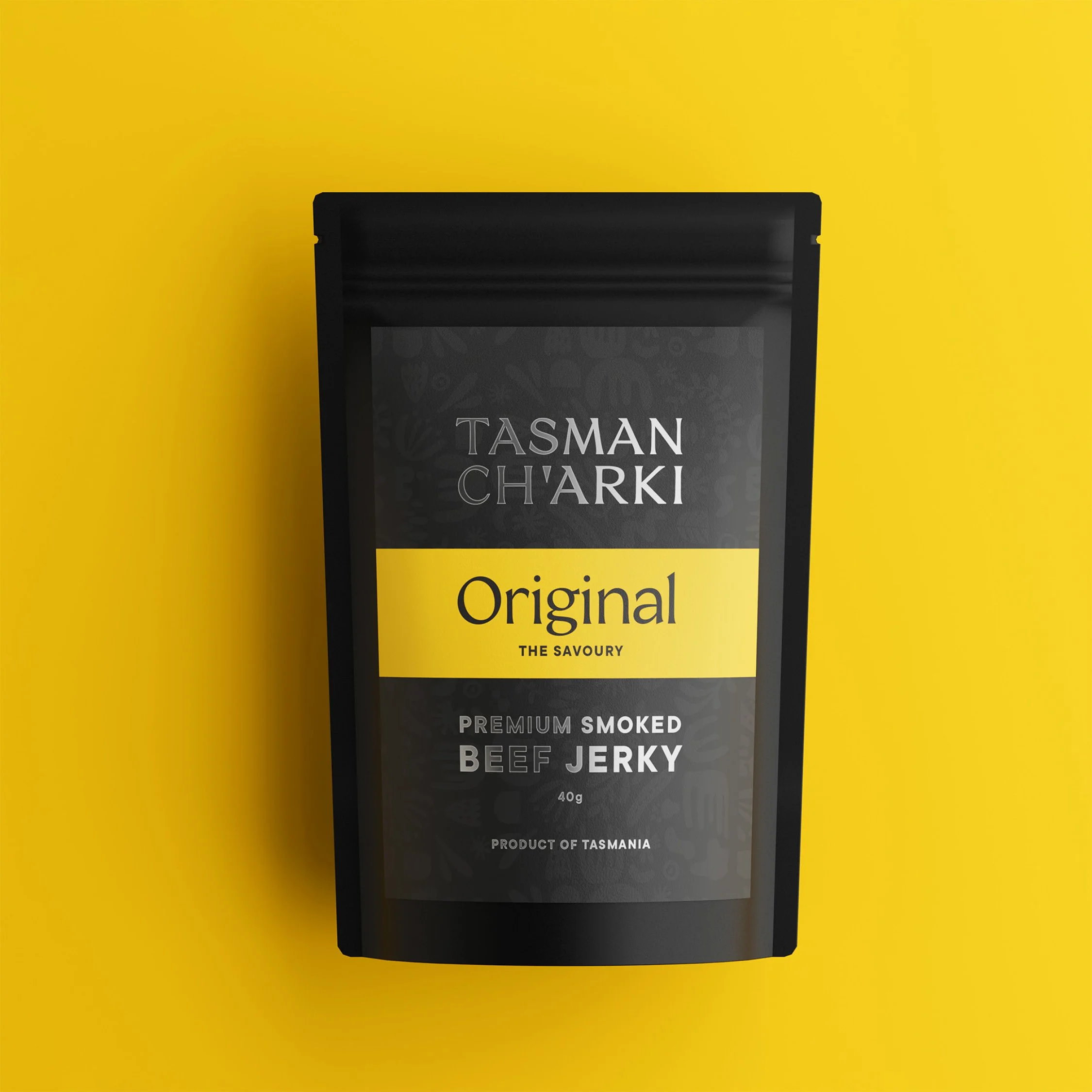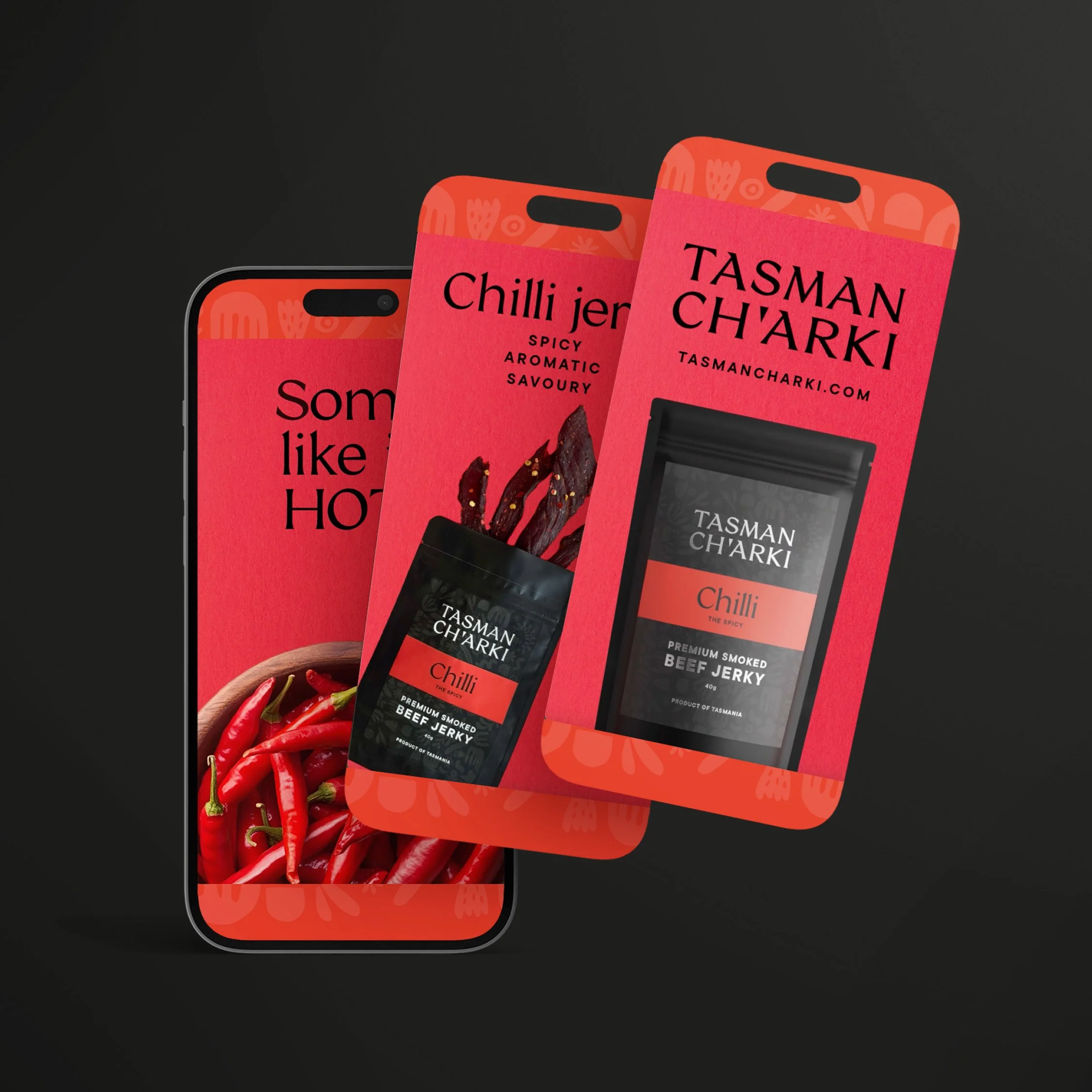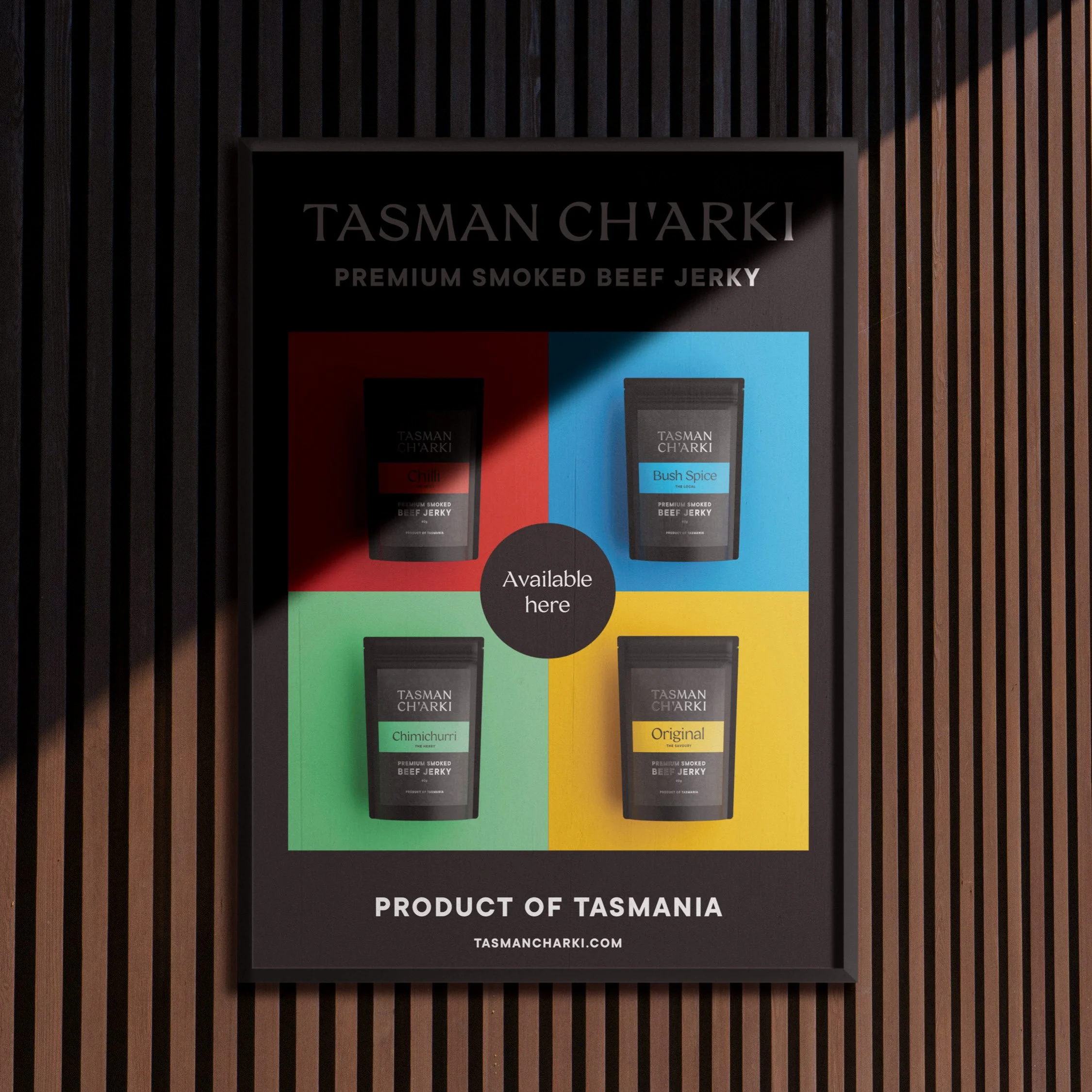 It’s not every day you get to be your own client! Co-founded by my very talented husband Mark, and myself, Tasman Ch’arki launched in late 2024 after years of experimentation and planning. Our premium Tasmanian made beef jerky has a unique flavour after hours of marinating, then carefully smoked for preservation and texture. Tasman Ch’arki’s name comes from the blending of Tasmanian ingredients and commitment to quality, and the Quechua word ch’arki (dried, salted meat.) Mark’s inspired and committed pursuit of a great product, and my background in design have allowed us to combine our skills to create some damn good jerky. (Well, we and a few others think so anyhow.) Thanks to Jarrod Lowe for writing some cool words that live on the website and our packaging. I still really like reading it.
