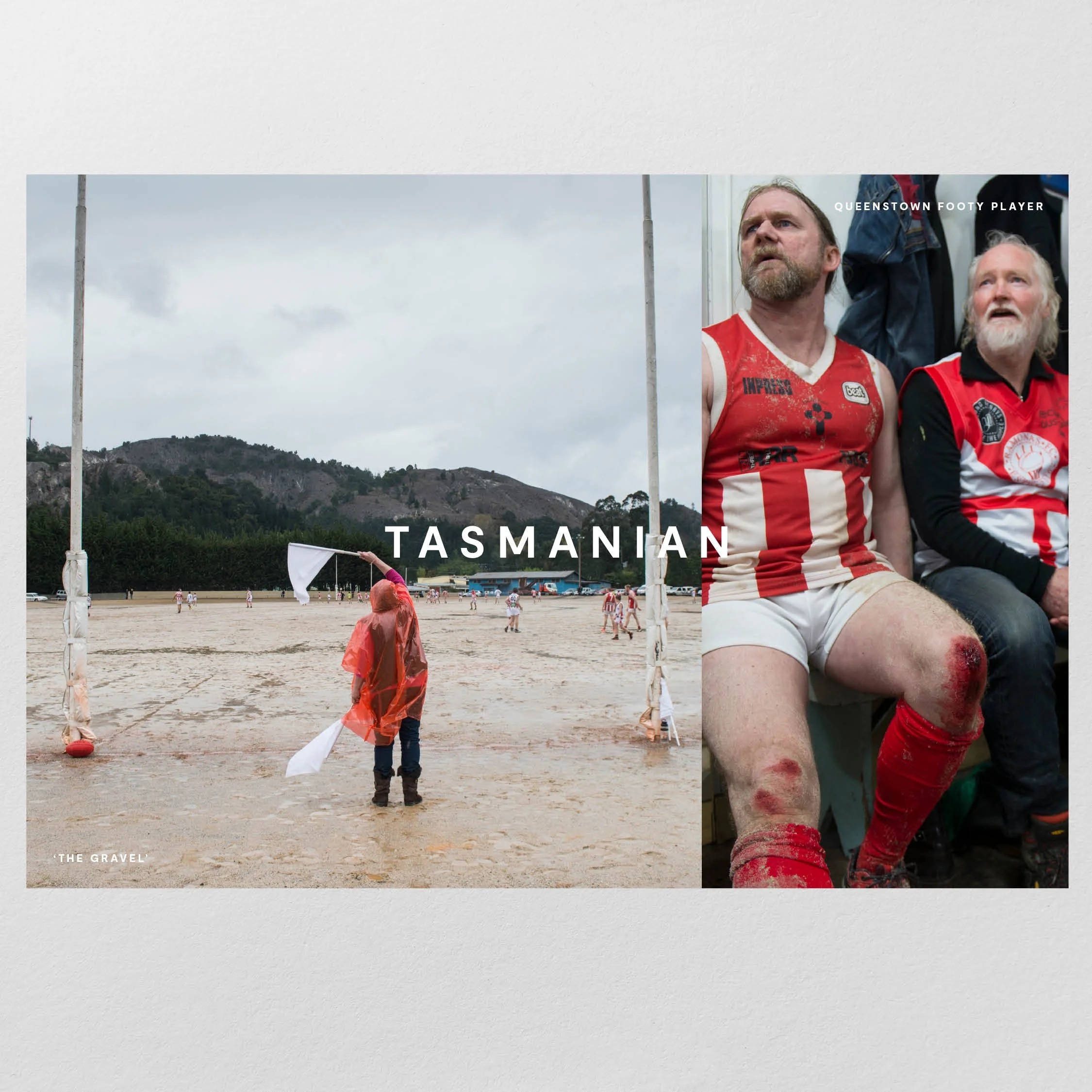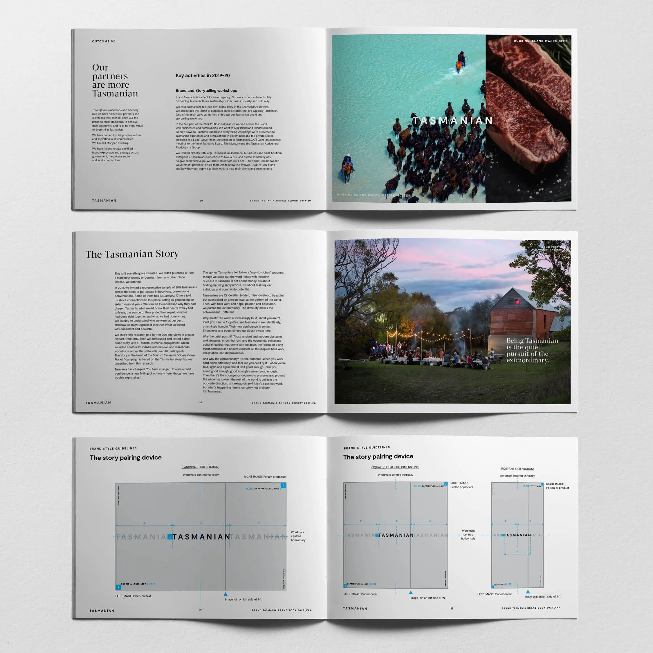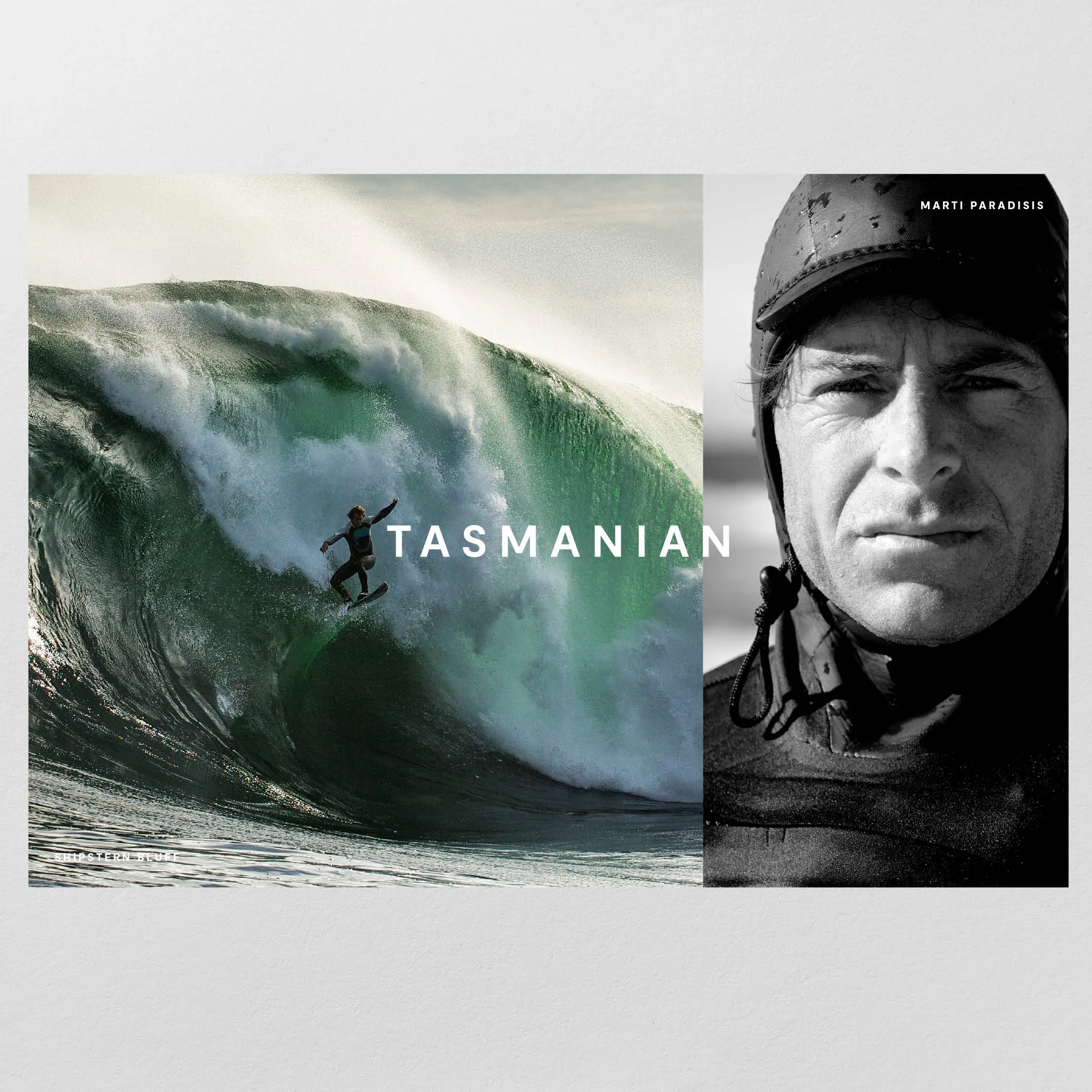 In a story-pairing there’s a vertical split in the word TASMANIAN between the final ‘A’ and the ‘N’, with a different image on each side of the split. The image on the left in the story-pairing conveys the inherent beauty of the environment, mixed with the challenge, struggle and perseverance that our ‘place’ requires of us. This aligns with the TASMANIA component of the wordmark. On the right of the story-pairing is the culture: what we do and create, how we contribute, aligns with the N. (The TASMANIAN brandmark is an adaption of the brand created for Tourism Tasmania.) The TASMANIAN story-pairing is a carefully considered device that is unifying in its essence and purpose, yet can be used to tell an infinite number of stories and visually express the indivduality of each Tasmanian. It is this story-telling that allowed Tasmanians to see themselves reflected in the brand of their place.