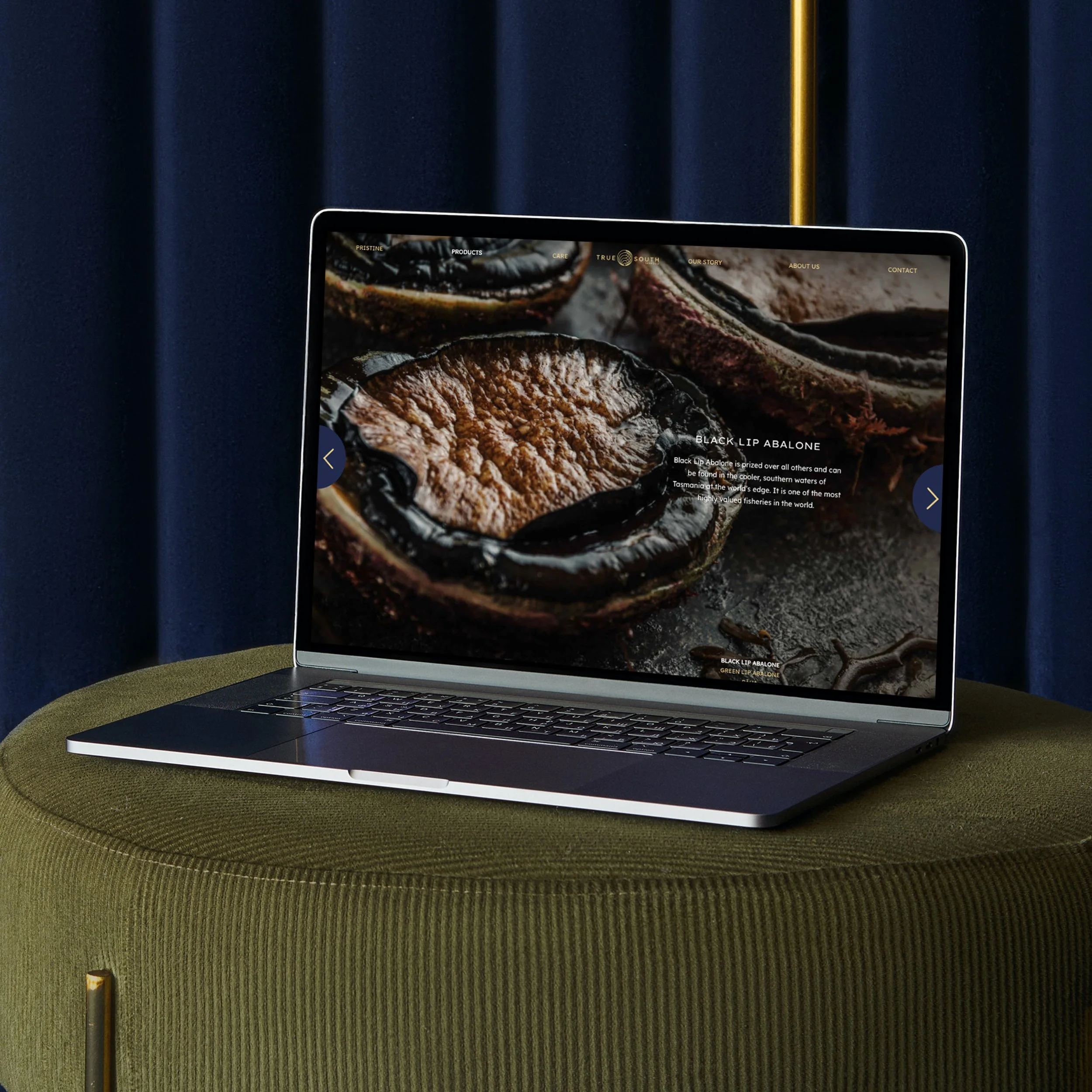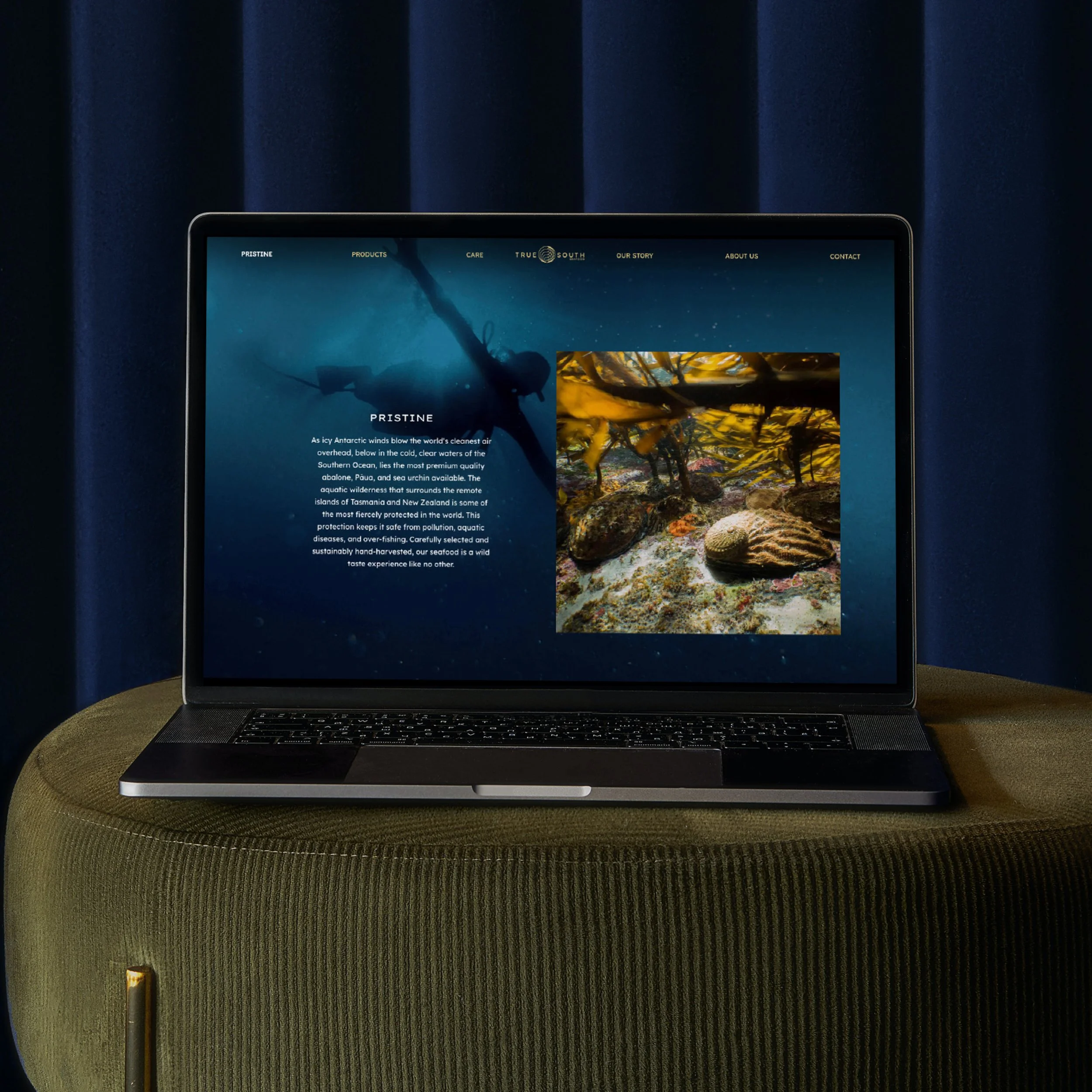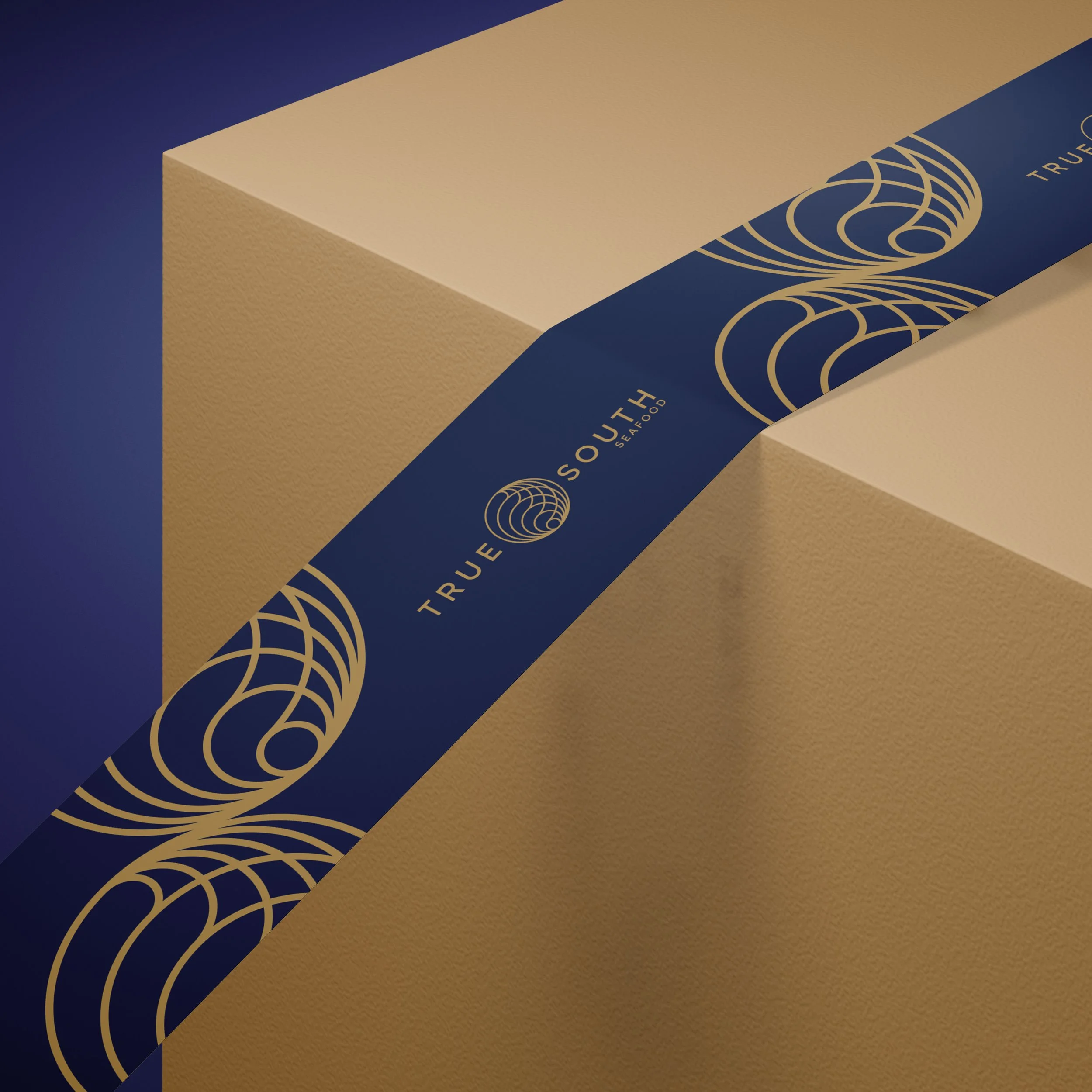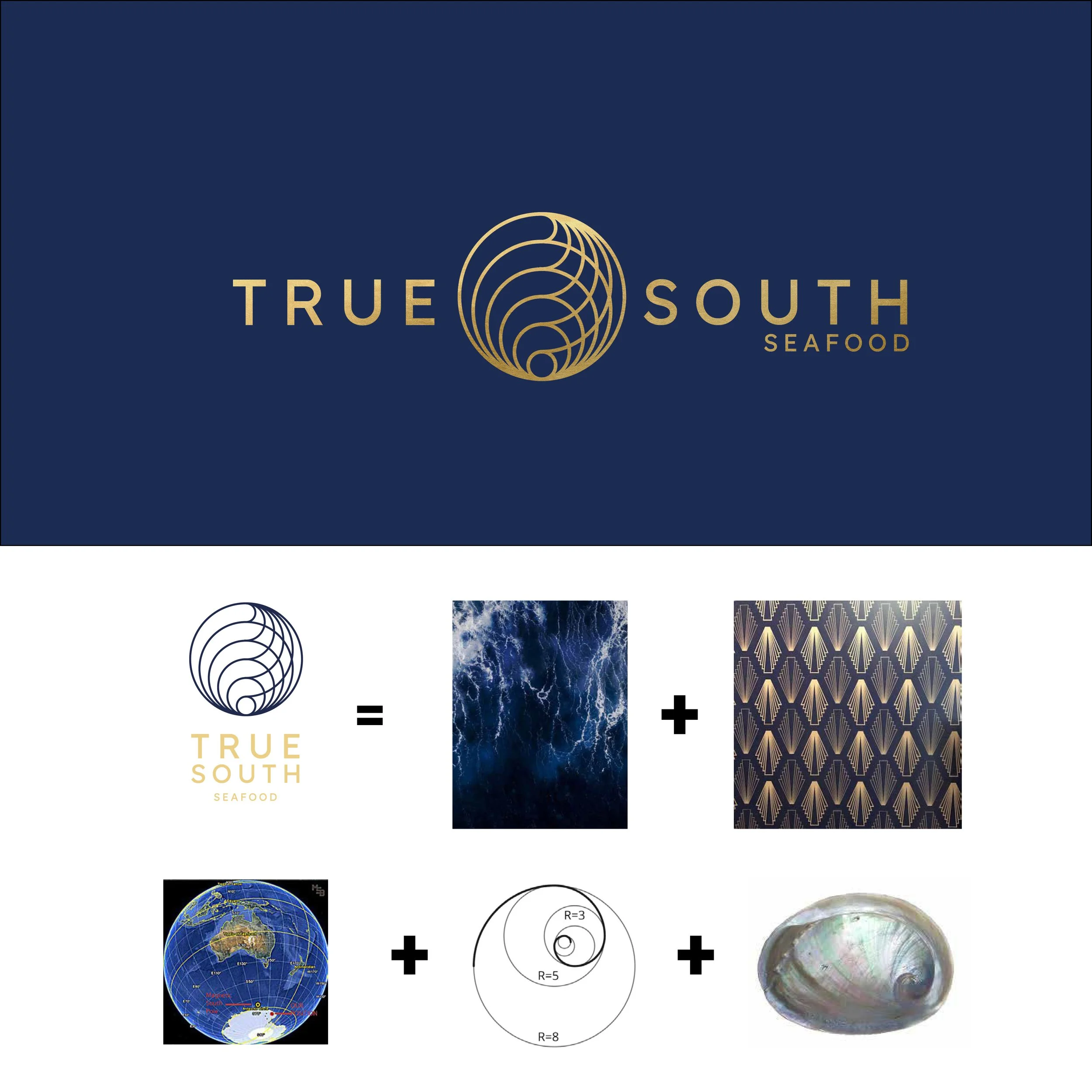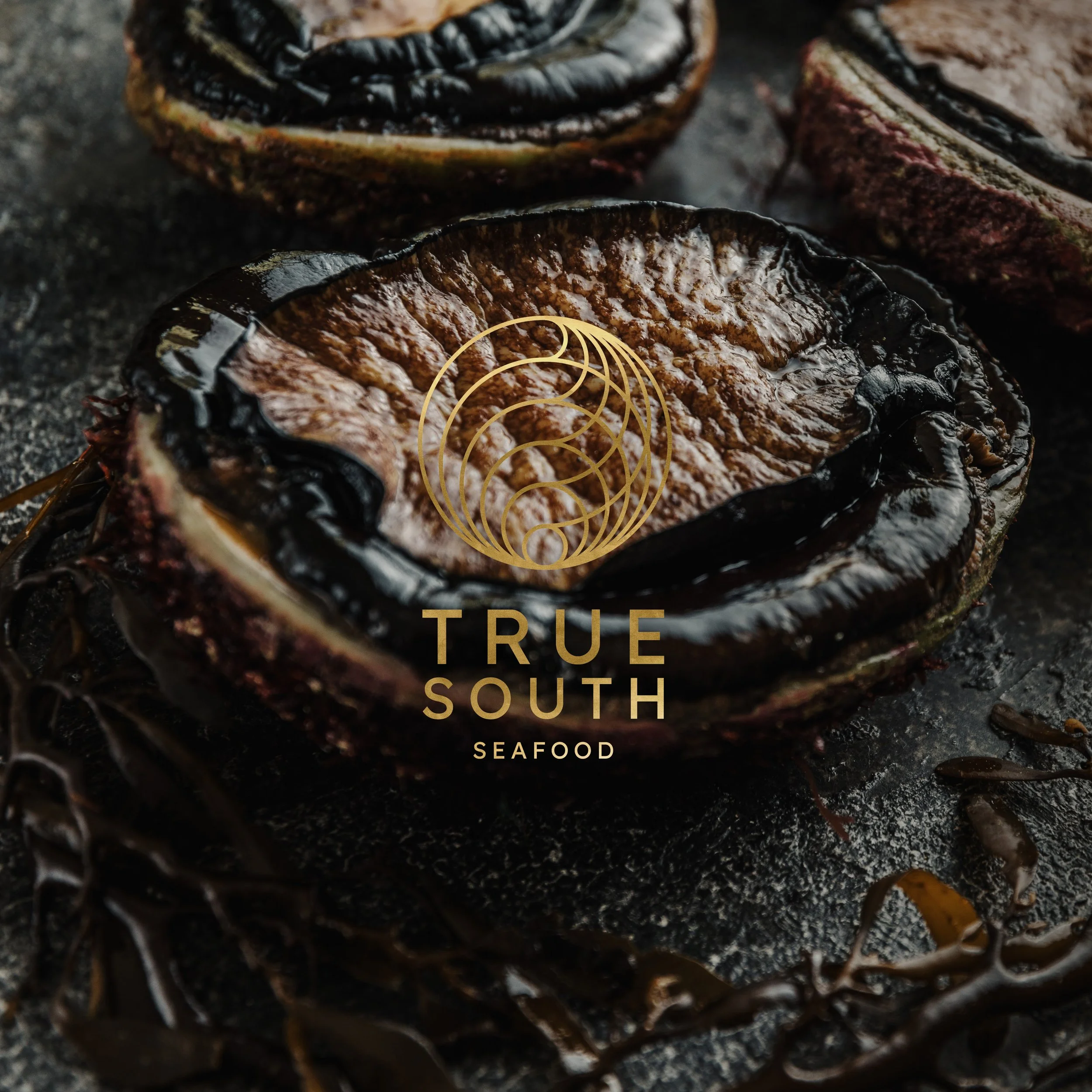 True South underwent several acquisitions and mergers before undergoing an extensive naming process in 2020. We arrived at ‘True South’ as the new name for the business – ‘True’ alludes to the purity and wild nature of the product and ‘South’ to represent both Tasmania and New Zealand as the premium seafood growing region. A luxurious and delicate product needed a logo to reflect this. Rendered in gold and the deep blue of the wild southern seas, the circular symbol is a combination of the Earth tilted to reveal its southern axis, blended with the golden ratio observed in the swirl of an abalone shell.
